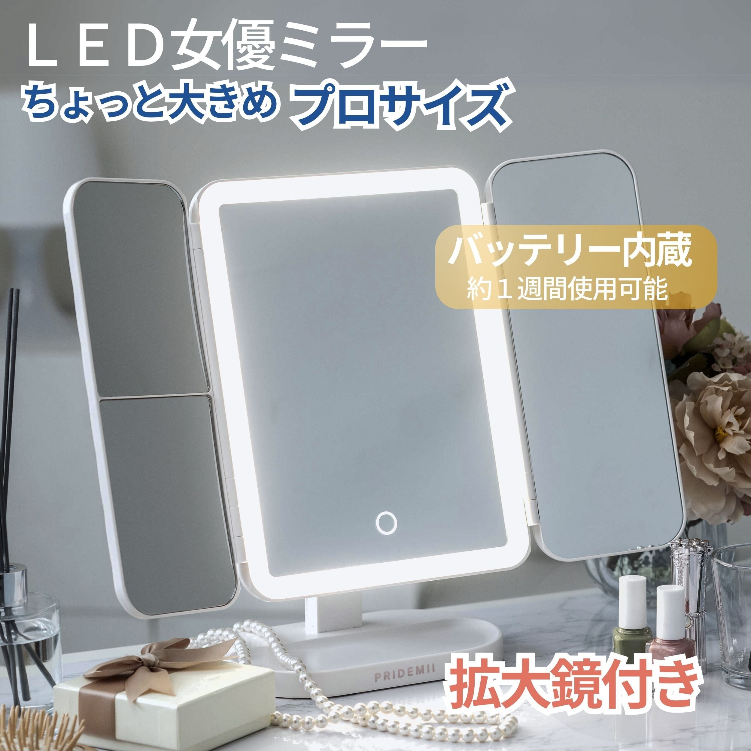 PRIDEMII 女優ミラー LEDライト 化粧鏡 卓上ミラー かわいい 多機能 バッテリー内蔵 ちょっと大きめ 三面鏡 卓上サイズ おしゃれな レザー調 明るさ無段階調光 3光色 昼光食 昼白色 電球色 拡大鏡 USB 充電 | KIJIMATSU